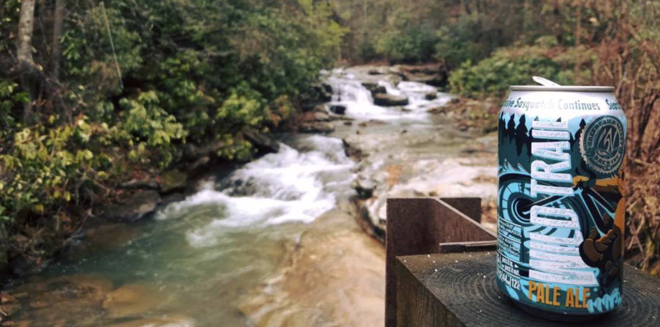 Design: Sasquatch is riding a mountain bike down a mountain and through a stream. He has a victory fist in the air. The can is in blues, greens and browns to resemble the mountains we love.