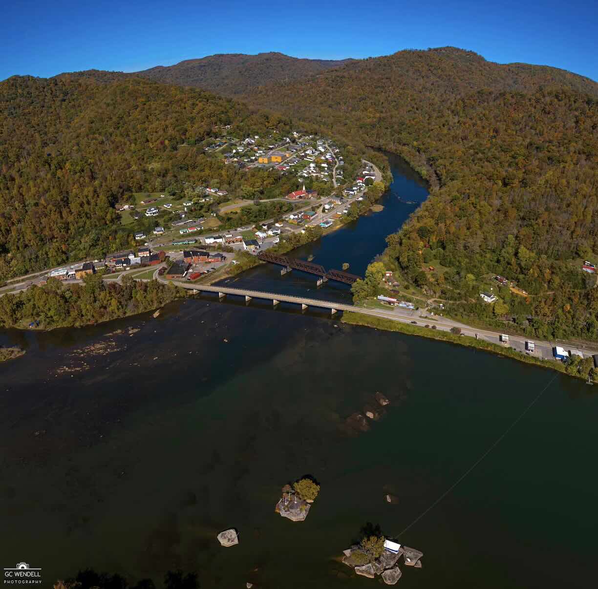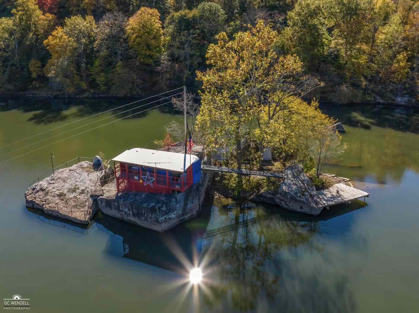 If you’ve ever driven through Gauley Bridge, West Virginia, on U.S. Route 60, you may have spotted a bizarre and unforgettable sight: a colorful Greyhound bus perched on a rock island in the middle of the river, complete with a front porch and an American flag. This one-of-a-kind fishing camp was created in the 1950s by local legend Walter “Bruiser” Cole, who ferried the bus to the island himself and turned it into a quiet riverside retreat where the New and Gauley rivers meet to form the Kanawha. Though it looks like it’s on the riverbank, it actually sits about 100 yards from shore—a true #WildAndWonderful West Virginia landmark.