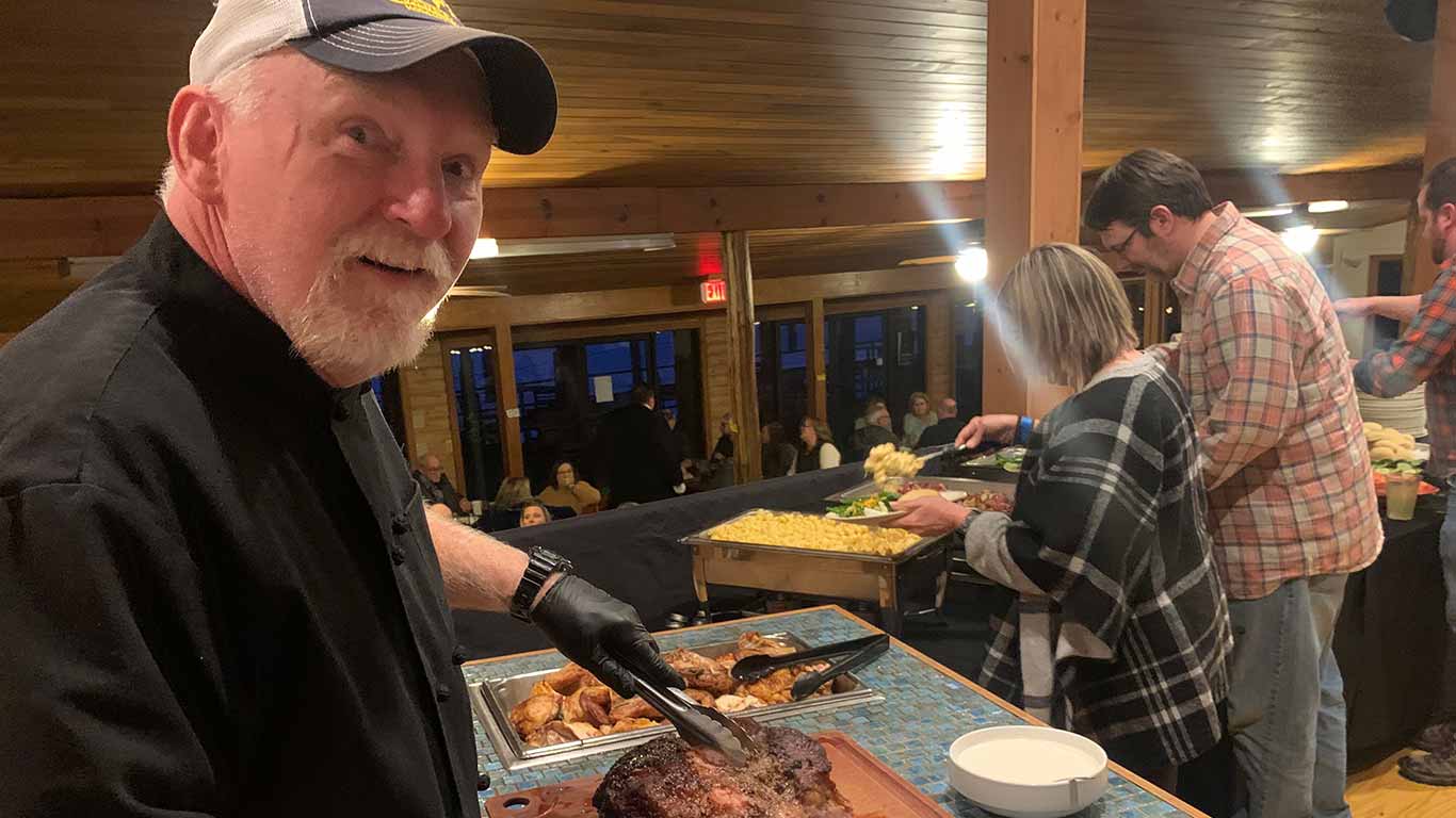 Dinner Menu includes Carved Roast Beef, Chicken Alfredo, Roasted Red Potatoes, Fresh Asparagus, Dinner Rolls & Red Velvet Cake. Plus light appetizers and salad bar.