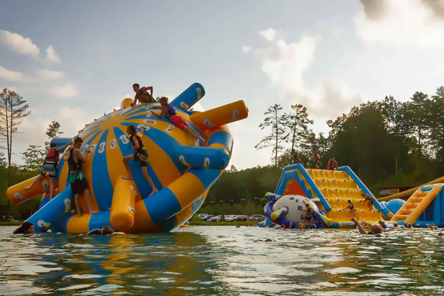 Wonderland Waterpark may be the coolest waterpark ever. At least, we think it is! This 5-acre spring fed lake is filled with inflatable toys, so you can climb to the top of an inflatable mountain before jumping into the water below! Groups can spend a whole or half day playing at the lake, swimming, jumping, sliding, and more! You can zipline into the water below, or be blobbed as high as possible! For those who may not want to swim, you can relax on the white sandy beach, play a game of volleyball, cornhole, or pingpong! For the littlest ones, there is a splash pad, too! See you on the beach!