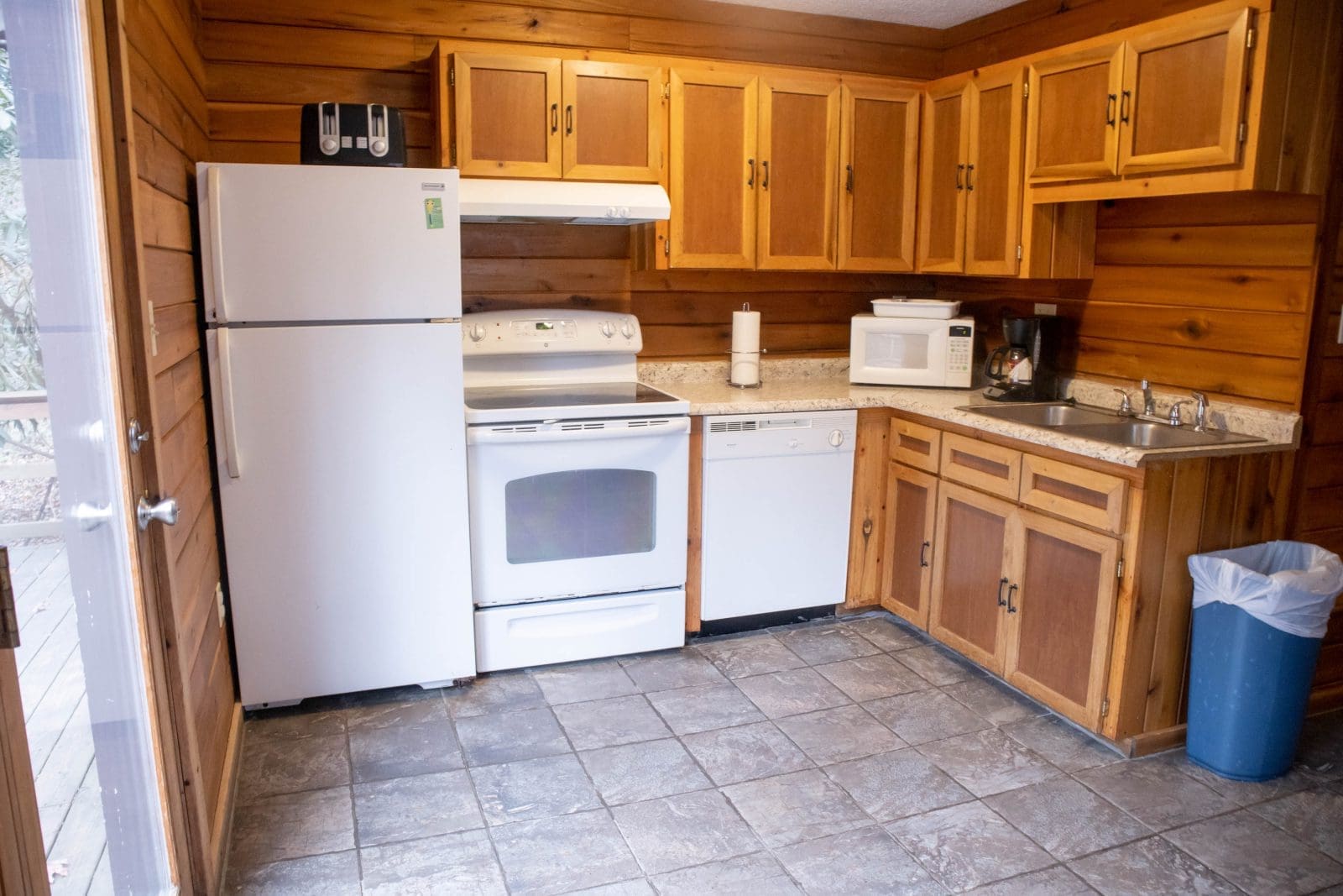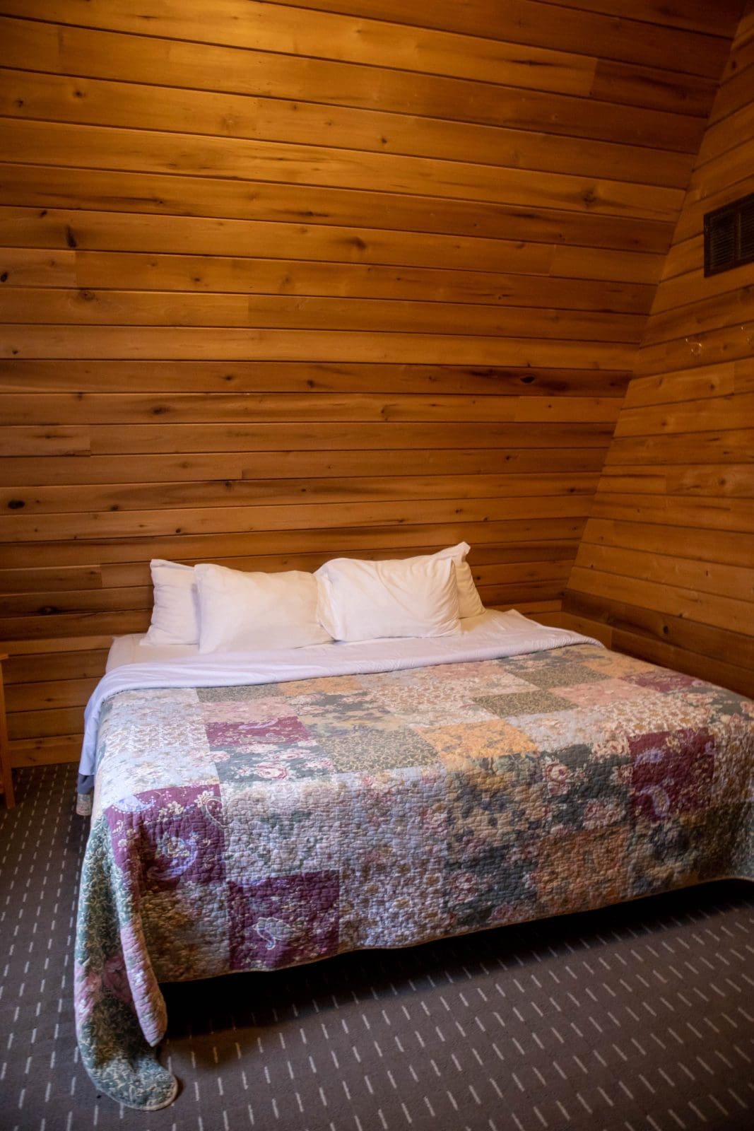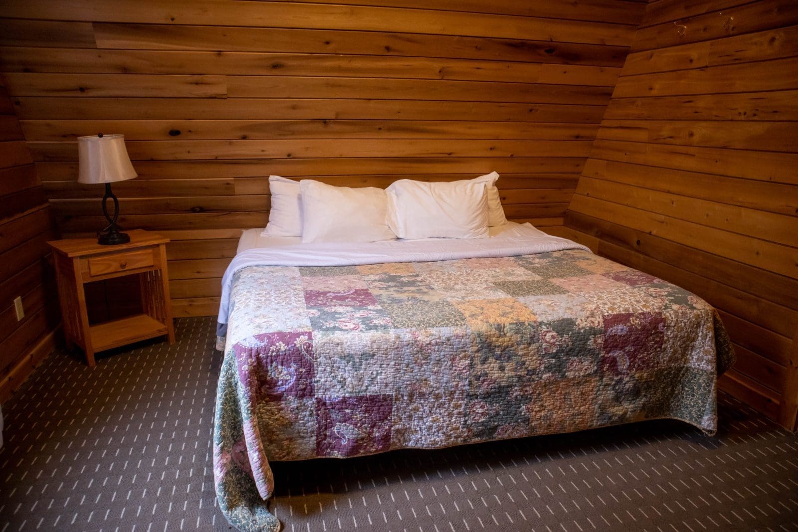 This peaceful Two Bedroom Chalet includes a full kitchen, family sized hot tub, and sleeps up to six people. Enjoy a peaceful getaway surrounded by trees and wildlife in this deluxe lodging option!