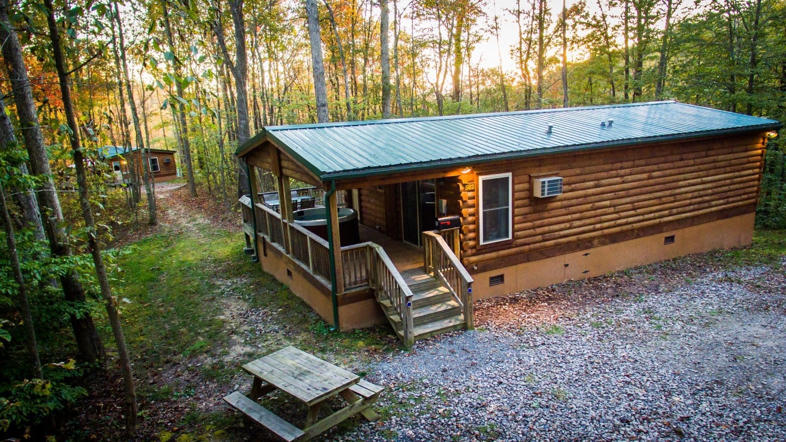 - Picnic table, fire pit, and hot tub are outside