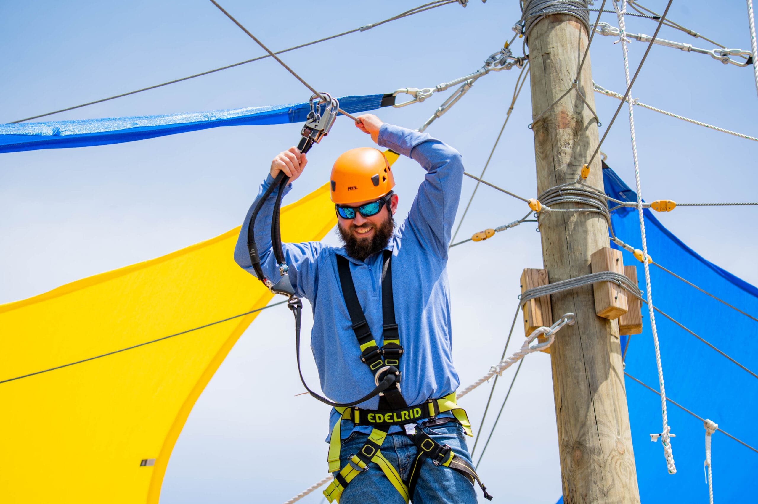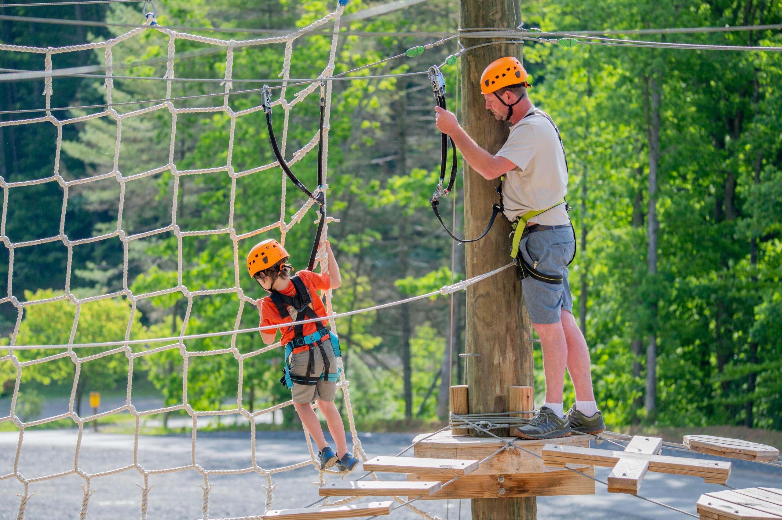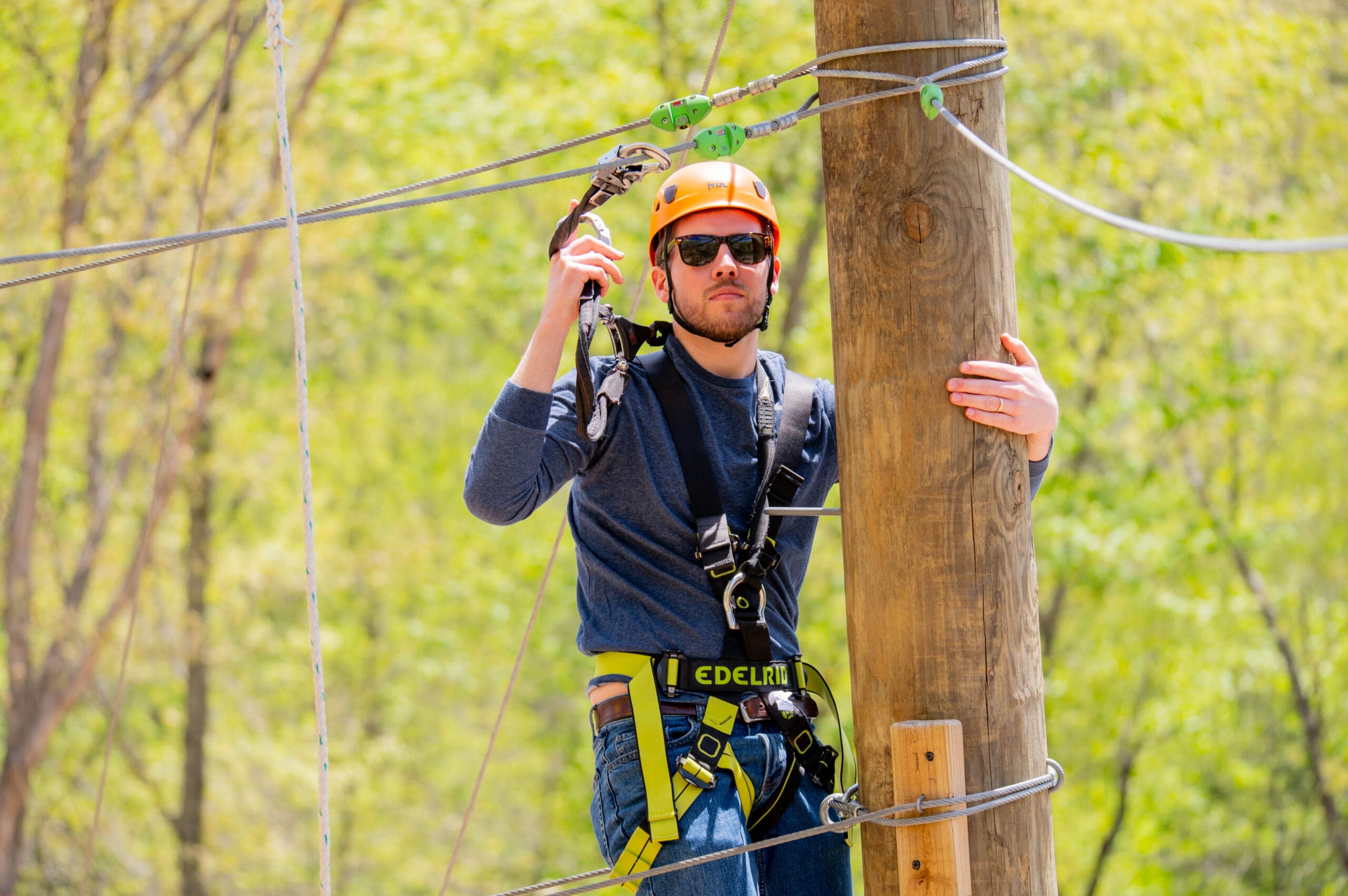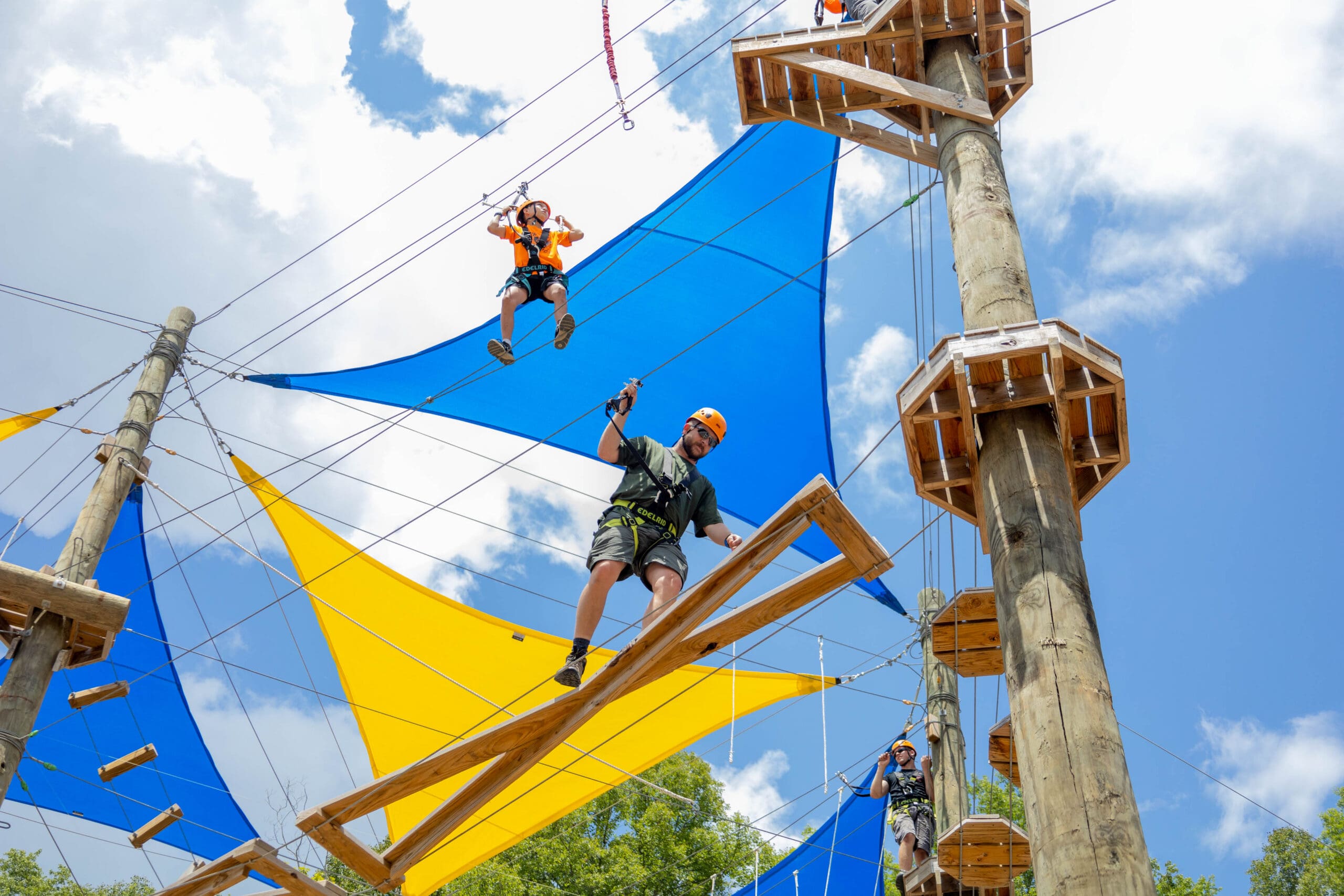 Join us for our newest adventure attraction ACE Adventure Aerial Park! Enjoy THREE levels that vary in height and difficulty! Our Adventure Aerial Park features a spiral staircase for easy access to the first two levels and from there a ladder to access the more challenging obstacles. Our first level is the easiest and suitable for kiddos as young as 5! Our second level is great for beginners and those looking to step out of their comfort zone. If you’re looking for a real challenge though, check out our third level! This level is 45′ above the ground and requires grit, determination, and a little upper body strength. If you’re looking for an exciting adventure activity, our Adventure Aerial Park is the perfect option for you! Since our aerial park is a three hour activity, it makes for a great addition to a half day waterpark pass or a rafting trip. Located adjacent to the Adventure Waterpark, you can spend your day jumping off inflatables before taking on obstacles in the sky all in one convenient spot!