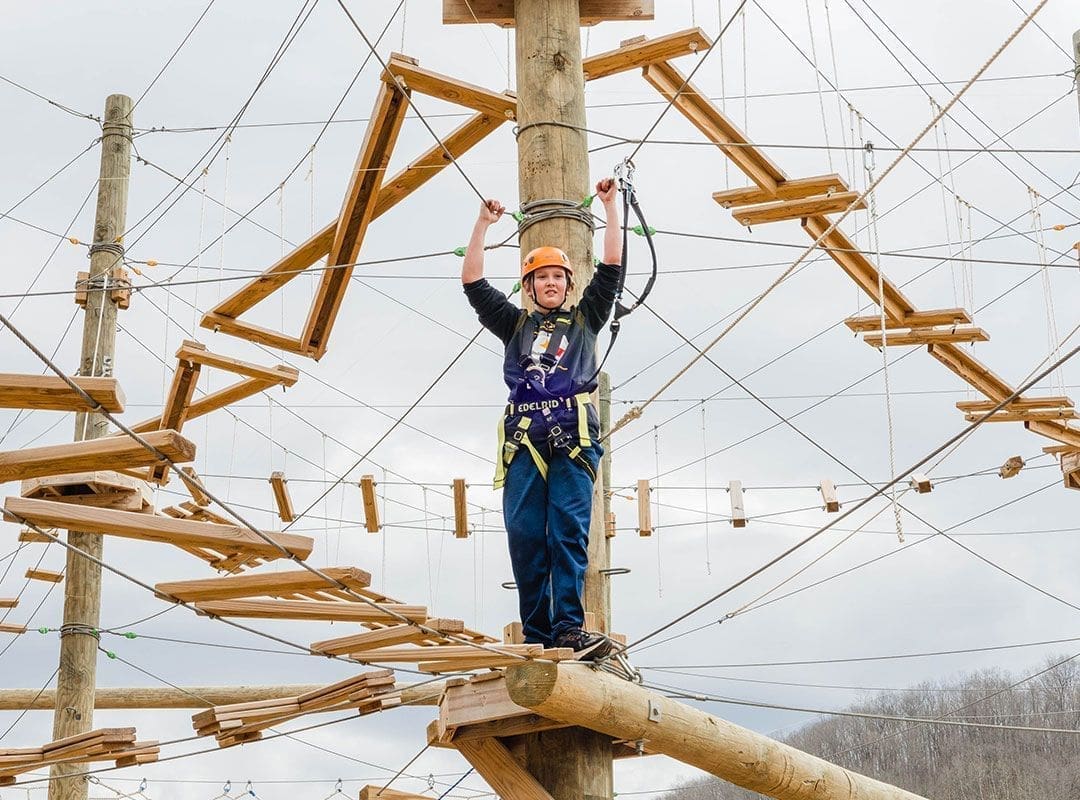 Join us for our newest adventure attraction ACE Adventure Aerial Park! Enjoy THREE levels that vary in height and difficulty! Our Adventure Aerial Park features a spiral staircase for easy access to the first two levels and from there a ladder to access the more challenging obstacles. Our first level is the easiest and suitable for kiddos as young as 5! Our second level is great for beginners and those looking to step out of their comfort zone. If you’re looking for a real challenge though, check out our third level! This level is 45′ above the ground and requires grit, determination, and a little upper body strength. If you’re looking for an exciting adventure activity, our Adventure Aerial Park is the perfect option for you! Since our aerial park is a three hour activity, it makes for a great addition to a half day waterpark pass or a rafting trip. Located adjacent to the Adventure Waterpark, you can spend your day jumping off inflatables before taking on obstacles in the sky all in one convenient spot!