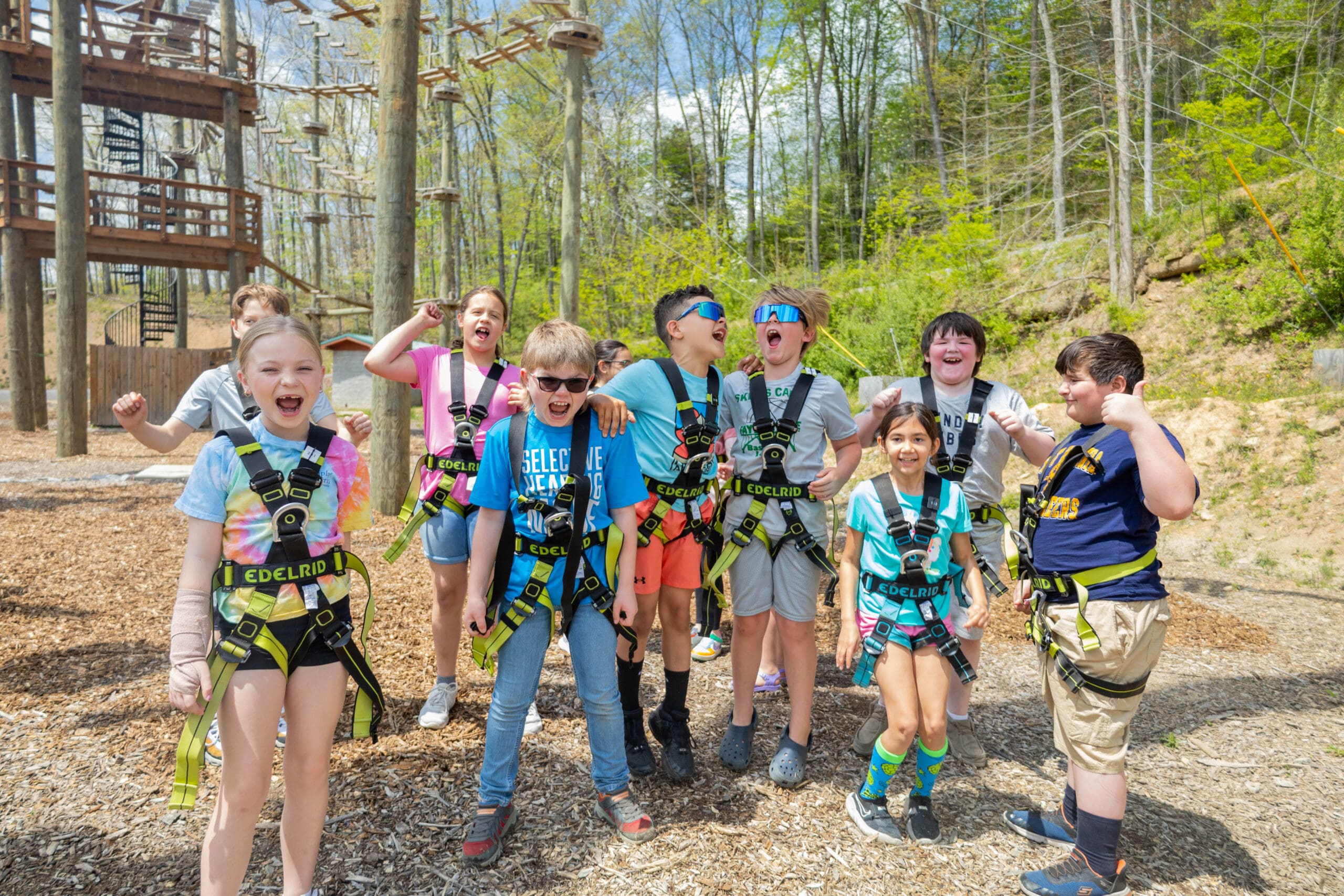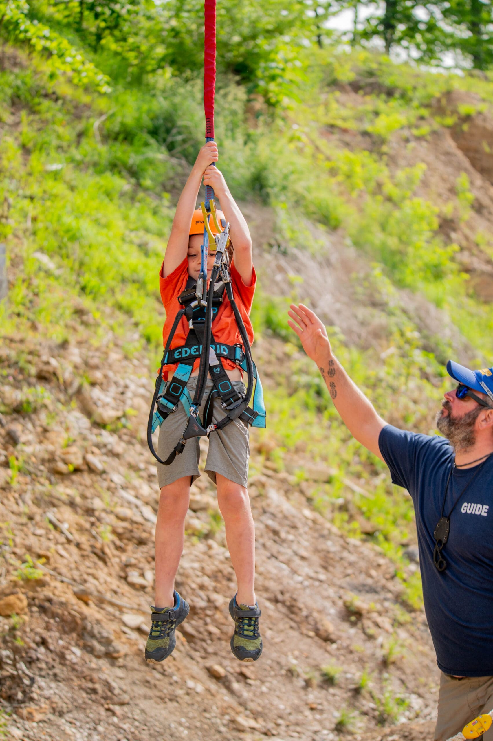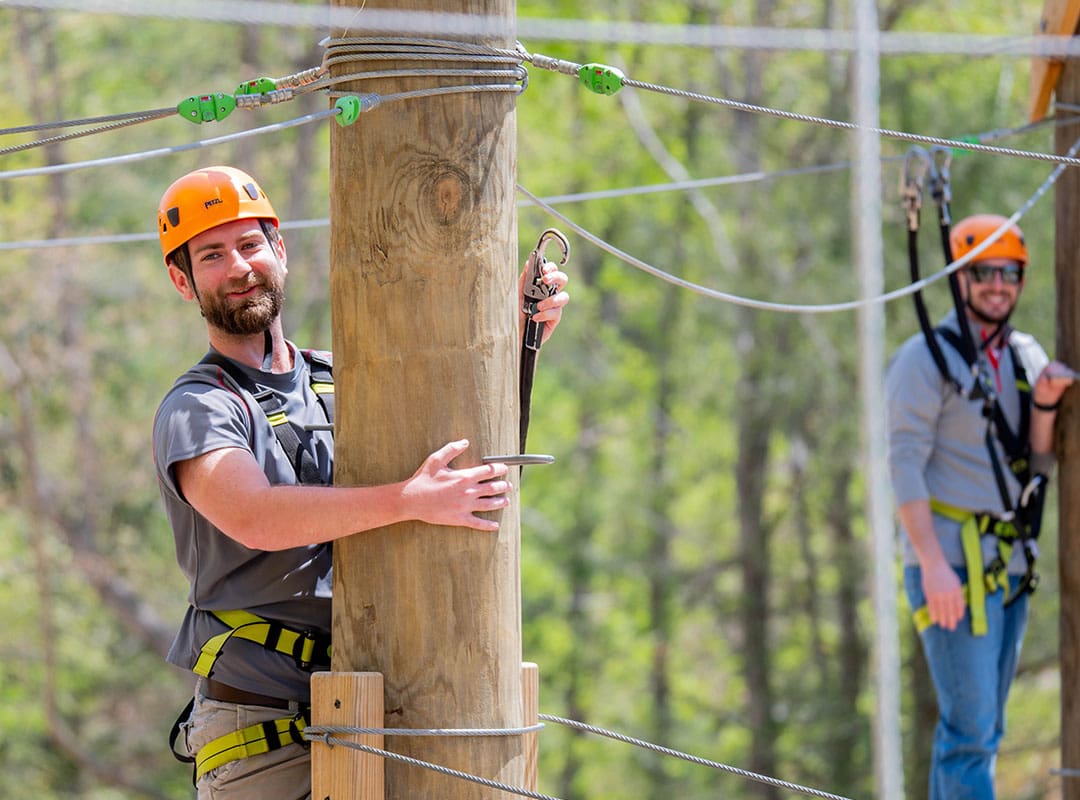 Join us for our newest adventure attraction ACE Adventure Aerial Park! Enjoy THREE levels that vary in height and difficulty! Our Adventure Aerial Park features a spiral staircase for easy access to the first two levels and from there a ladder to access the more challenging obstacles. Our first level is the easiest and suitable for kiddos as young as 5! Our second level is great for beginners and those looking to step out of their comfort zone. If you’re looking for a real challenge though, check out our third level! This level is 45′ above the ground and requires grit, determination, and a little upper body strength. If you’re looking for an exciting adventure activity, our Adventure Aerial Park is the perfect option for you! Since our aerial park is a three hour activity, it makes for a great addition to a half day waterpark pass or a rafting trip. Located adjacent to the Adventure Waterpark, you can spend your day jumping off inflatables before taking on obstacles in the sky all in one convenient spot!
