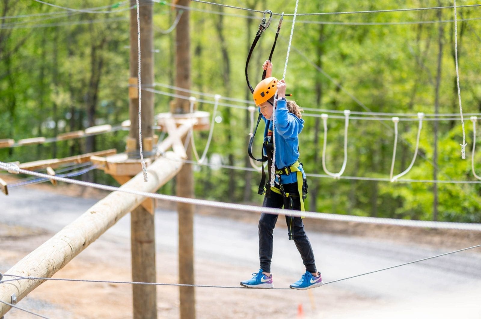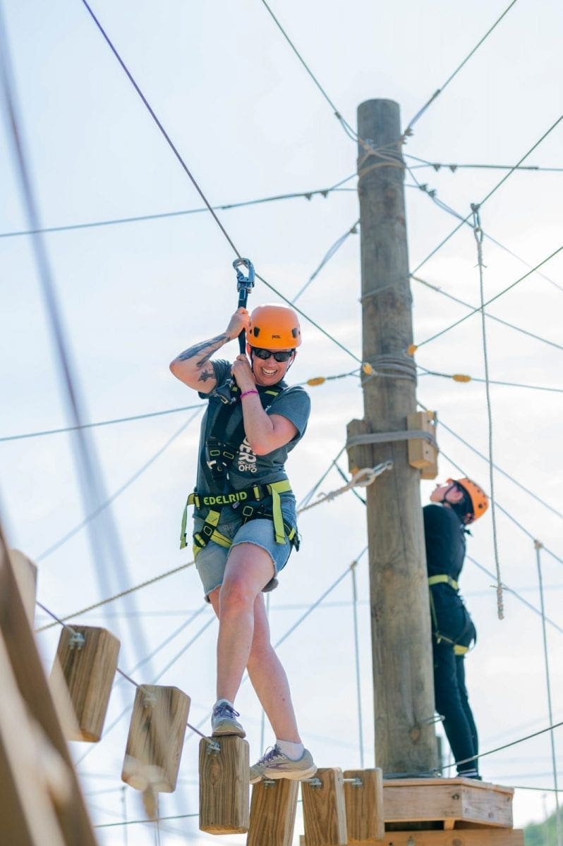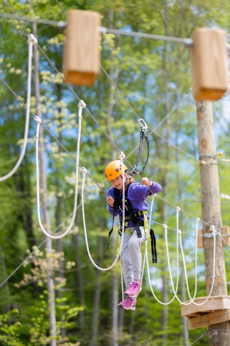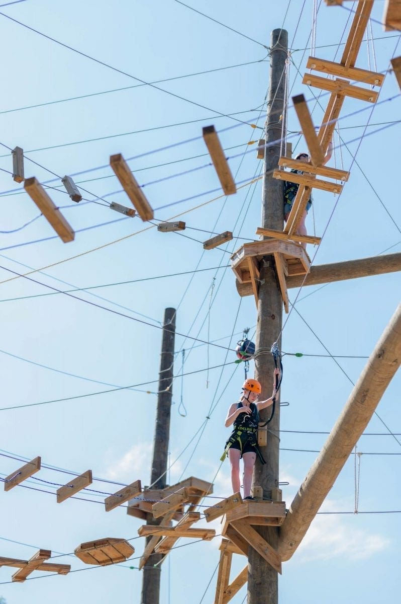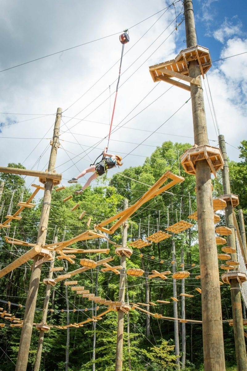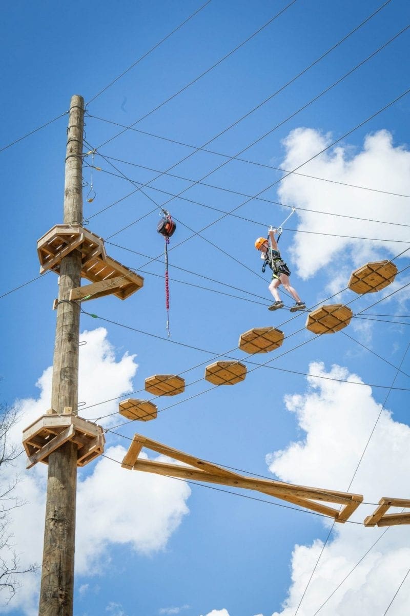 Join us for our newest adventure attraction ACE Adventure Aerial Park! Enjoy THREE levels that vary in height and difficulty! Our Adventure Aerial Park features a spiral staircase for easy access to the first two levels and from there a ladder to access the more challenging obstacles. Our first level is the easiest and suitable for kiddos as young as 5! Our second level is great for beginners and those looking to step out of their comfort zone. If you’re looking for a real challenge though, check out our third level! This level is 45′ above the ground and requires grit, determination, and a little upper body strength. If you’re looking for an exciting adventure activity, our Adventure Aerial Park is the perfect option for you! Since our aerial park is a three hour activity, it makes for a great addition to a half day waterpark pass or a rafting trip. Located adjacent to the Adventure Waterpark, you can spend your day jumping off inflatables before taking on obstacles in the sky all in one convenient spot!