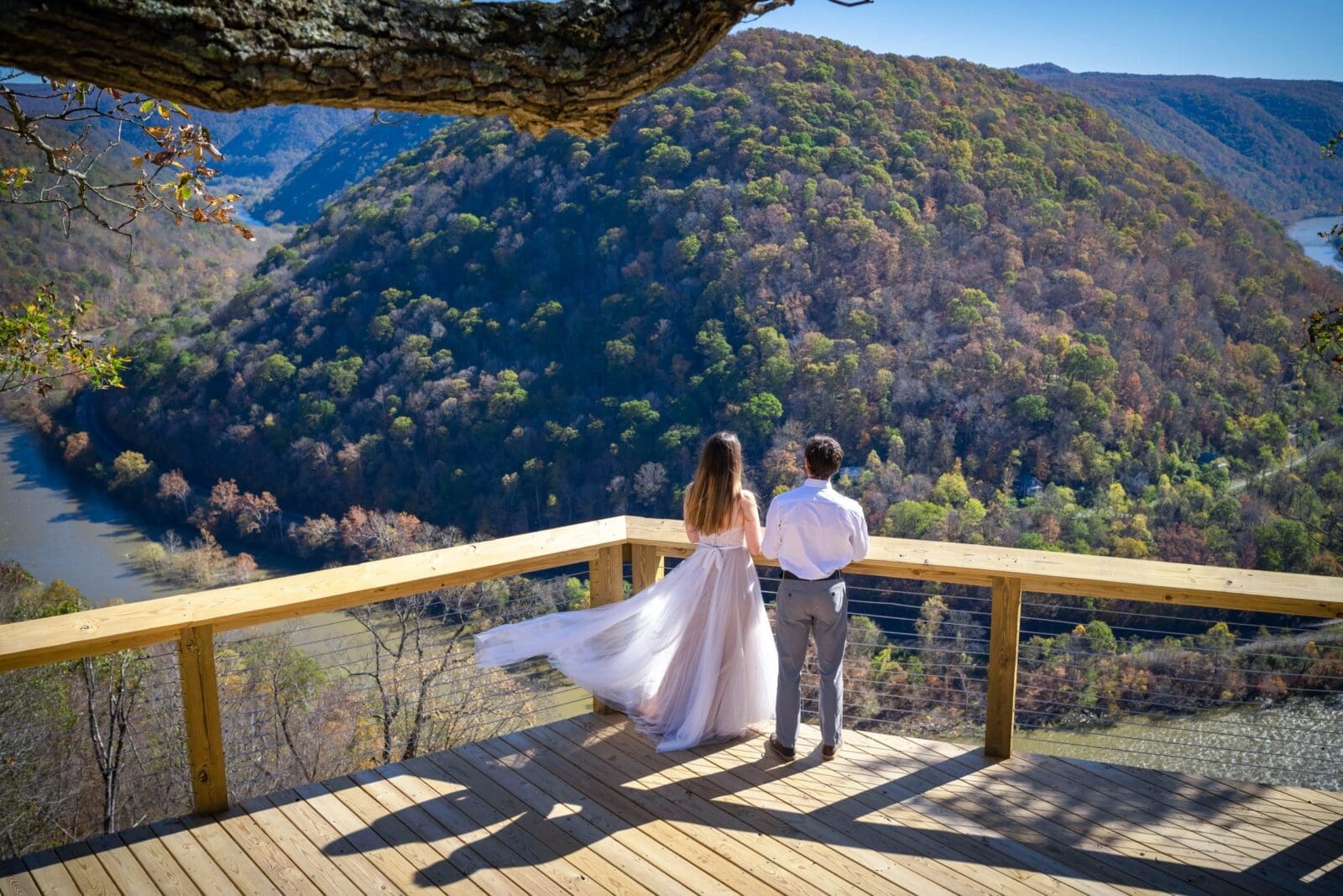 The Mountain Views Micro-Wedding Package includes a 2 hour ceremony designed to be a short private event. This ceremony will take place at Concho Overlook, overlooking the New River and the historic town of Thurmond. Chairs will be provided for up to 20 guests, and minimal decorating is allowed.